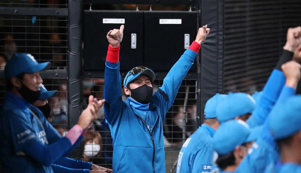 <西・日>7回、山田の内野ゴロで外崎が本塁セーフになったプレーにリクエストを要求し、アウトに覆り大喜びの新庄監督(撮影・尾崎 有希)