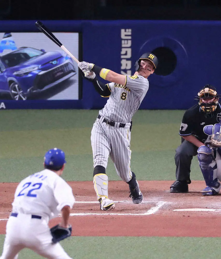“ショック”を振り払った。直前の無死一塁で前を打つ近本が二ゴロ。一塁走者は二塁封殺となり、併殺を狙った遊撃手・京田の一塁送球が悪送球となってボールはファウルゾーンに転がったが、二塁を狙った近本が憤死して2死無走者と好機はしぼんだ。その悪い空気を背番号8のスイングが払拭(ふっしょく)。やや高めに浮いた初球のスライダーを完璧に捉えた。