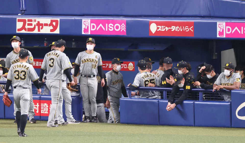 <中・神>10回1死一、二塁、サヨナラ負けを喫し、引き揚げる矢野監督(中央)ら阪神ナイン(撮影・北條 貴史)