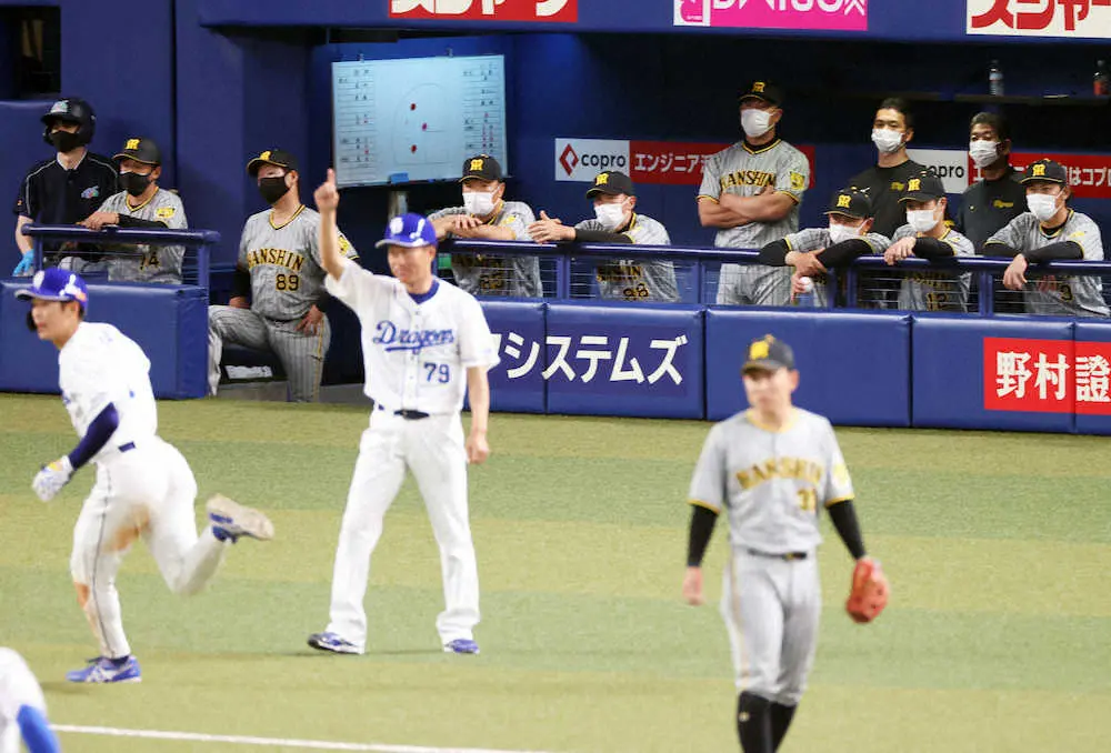 <中・神>10回1死一、二塁、サヨナラ負けに呆然の矢野監督ら阪神ナイン(撮影・北條 貴史)