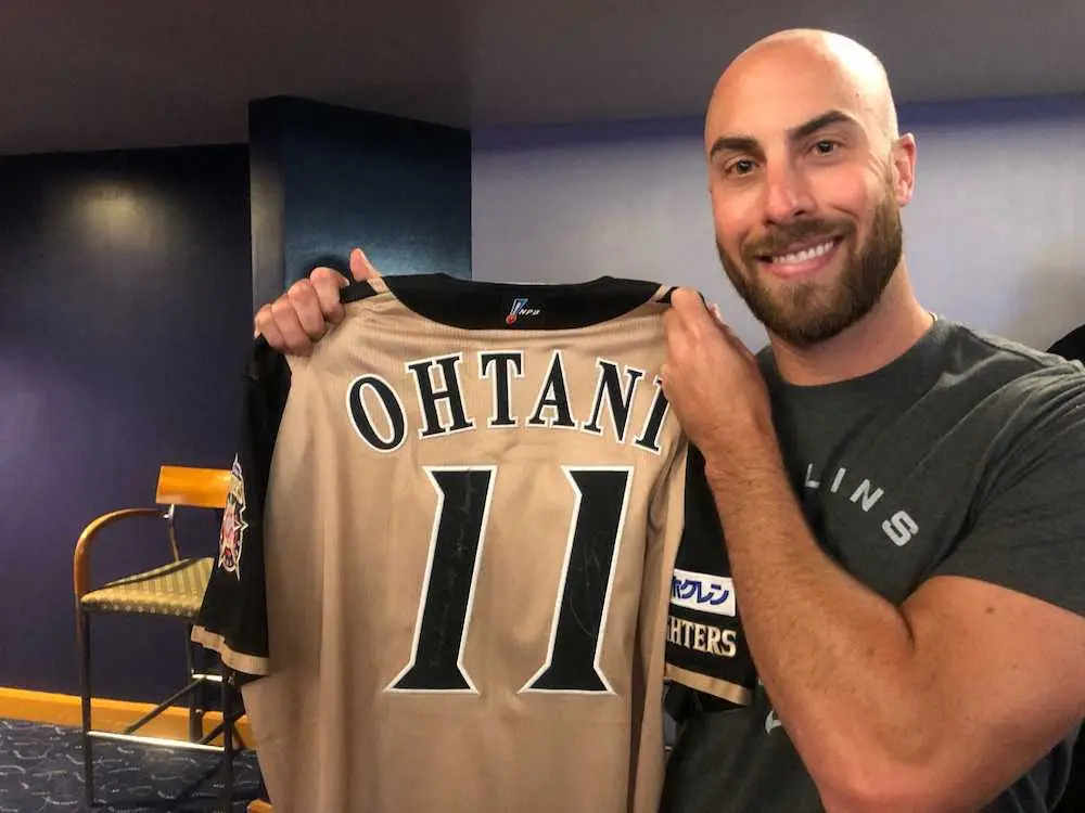 大谷の日本ハムの16年当時のビジターユニホームを持参し「To Anthony, 2016 Japan Championship」の文字とサインを書いてもらい大喜び。同年の日本シリーズで優秀選手に輝いた右腕は「あの日本シリーズは本当に楽しかった。彼はこのユニホームを見てとても驚いて、笑っていた。会うのは3年ぶり。とても大人になっていたね」と、うれしそうに話した。
