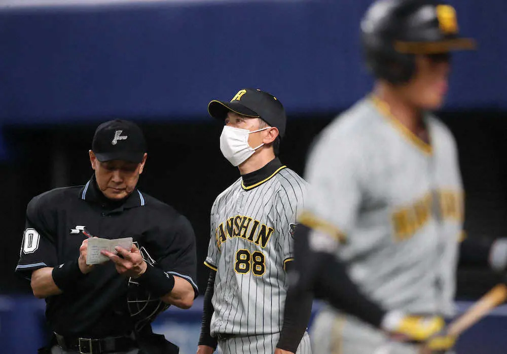 <中・神>選手交代を告げる矢野監督(右は糸井)(撮影・成瀬 徹)