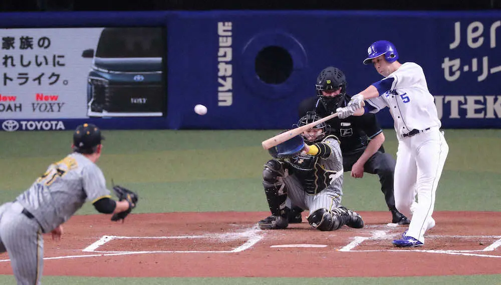 <中・神>初回 2死二、三塁 右翼線に先制の2点適時二塁打を放つ阿部(投手・桐敷)(撮影・成瀬 徹)