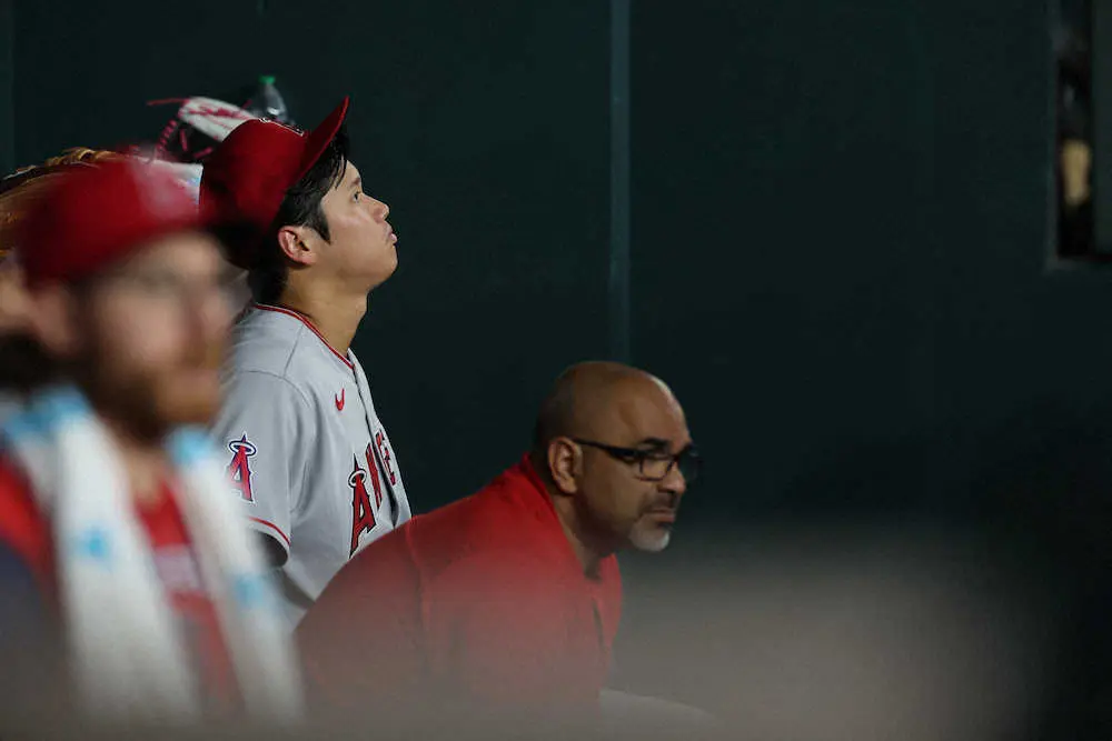 <レンジャーズ・エンゼルス>3回、ベンチで厳しい表情の大谷(撮影・光山 貴大)