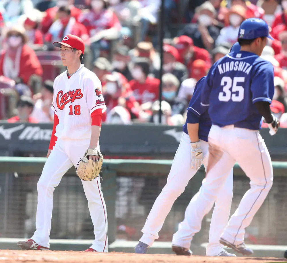 <広・中>初回、京田の2点適時打で木下拓(35番)らが生還し、この回だけで4点を奪われた森下(左)(撮影・坂田 高浩)