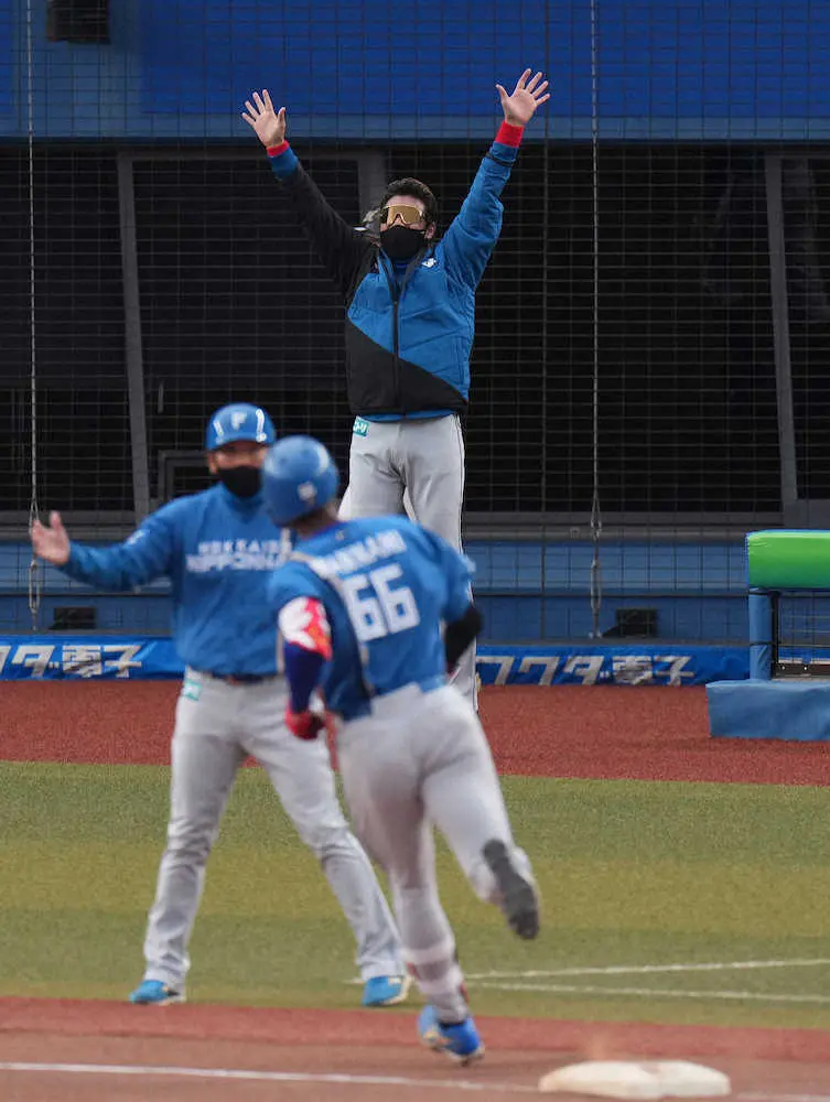 <ロ・日>10回、万波の先制ソロに新庄監督も飛び上がって喜ぶ(撮影・沢田 明徳)