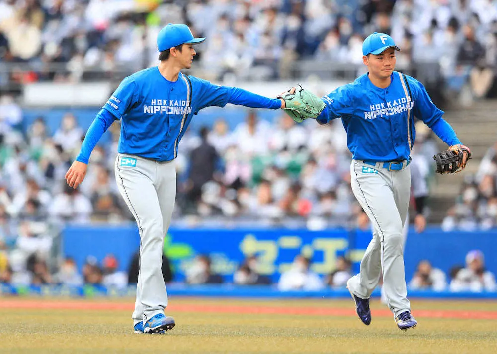 <ロ・日>6回を投げ終え、清宮(右)とグラブタッチをかわす上沢 (撮影・白鳥 佳樹)