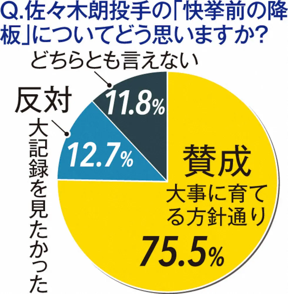 ロッテの佐々木朗が「2試合連続完全試合」の偉業を目前にした8回で降板。この井口監督の決断について、スポニチのツイッター「スポニチ野球記者」では緊急アンケートを実施。75・5%と圧倒的多数のファンが賛成で、「先の方が大事!」「0―0だったし英断と思います」などの声が多数寄せられた。「球数も前回よりも多く、今年一年、ケガなくローテを守るためにもこの決断は井口監督の英断だと信じています」「選手を守るのが監督の仕事」などの意見が大多数を占めた。