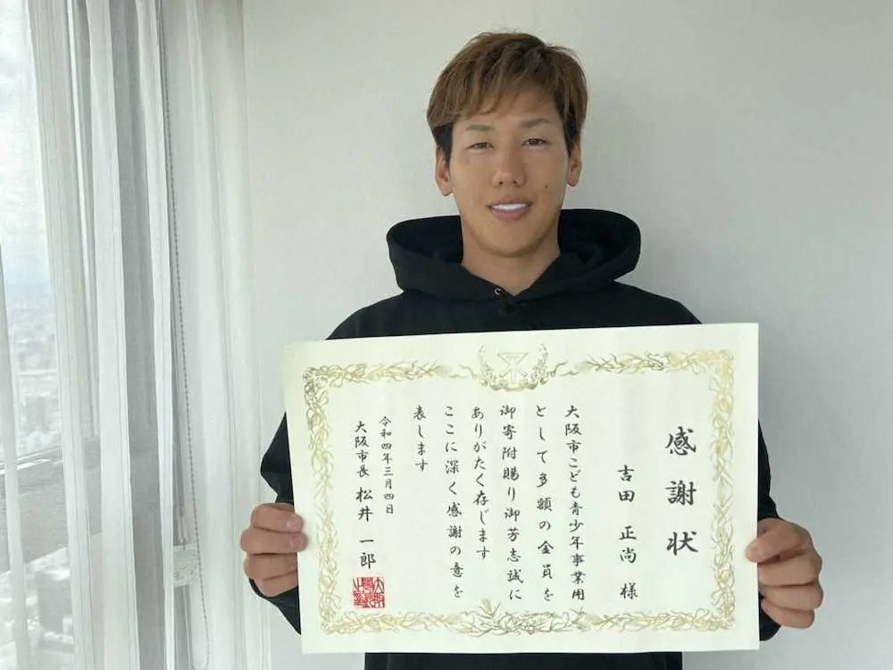 吉村洋文大阪府知事から感謝状をもらったオリックス・吉田正尚 Photo by 提供写真 オリックス吉田正に大阪府、大阪市から感謝状 ギャラリーで見る この記事のフォト 2022年04月19日の画像一覧 もっと見る 2022年04月19日の画像をもっと見る