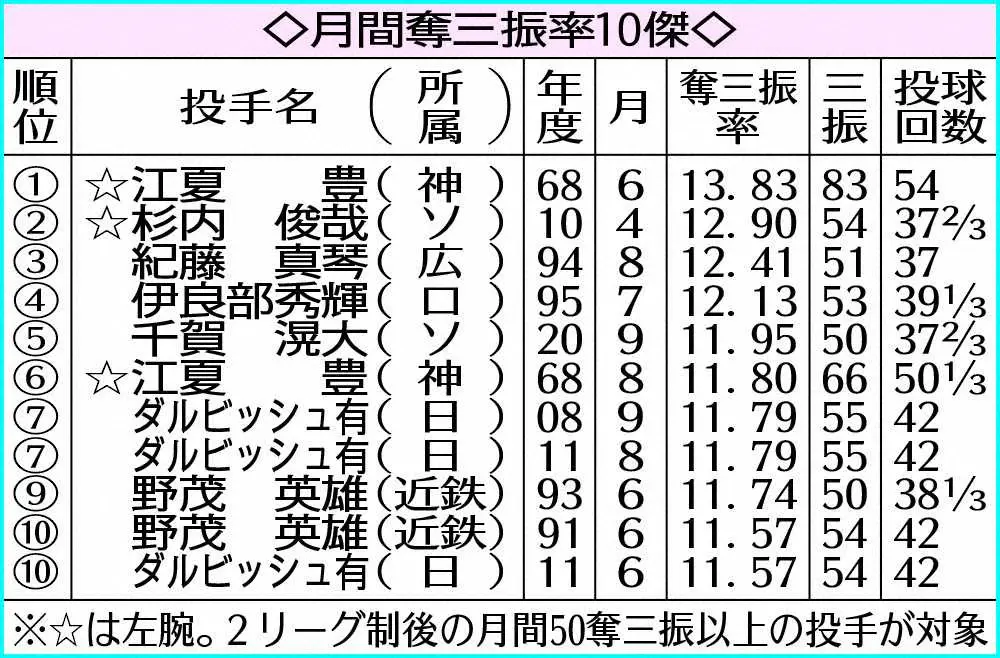 今季奪った三振も両リーグ断トツの56(2位はソフトバンク・千賀の31)。今月だけでも46を奪い、月間50奪三振はもちろん、60の大台まで見えてきた。50奪三振は20年9月に千賀(50奪三振)が達成しているが、60奪三振となると71年9月の鈴木啓示(近鉄=61奪三振)が最後で、到達すれば51年ぶりだ。