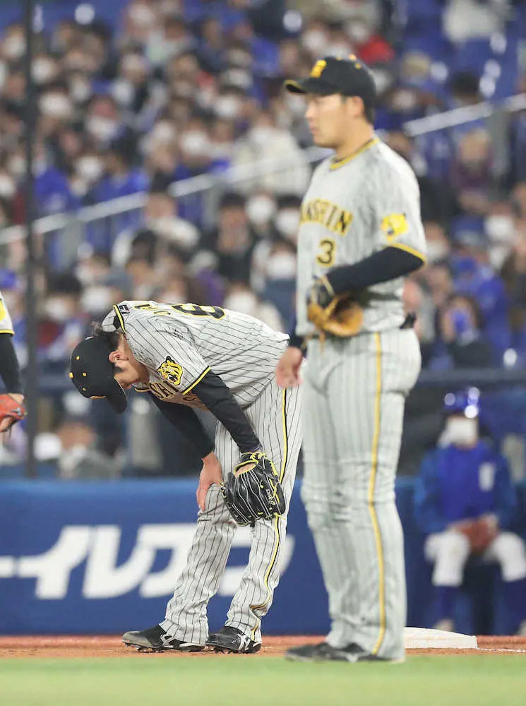 <D・神> 7回無死一塁、大山の野選で肩を落とす小川(左)(撮影・平嶋 理子)