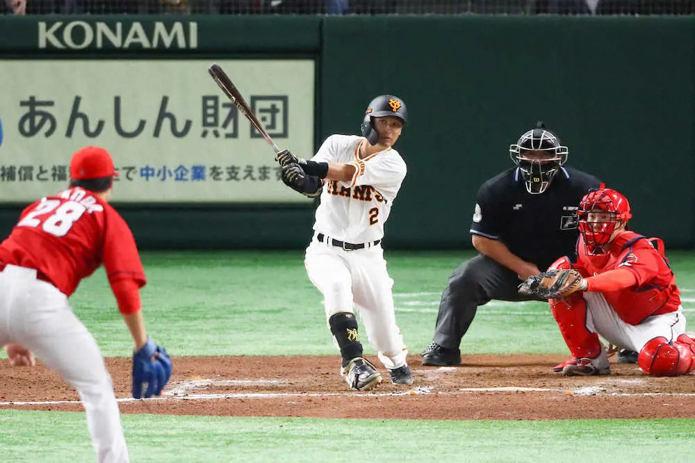 <巨・広>8回、二塁打を放つ吉川(投手・床田)(撮影・会津 智海)