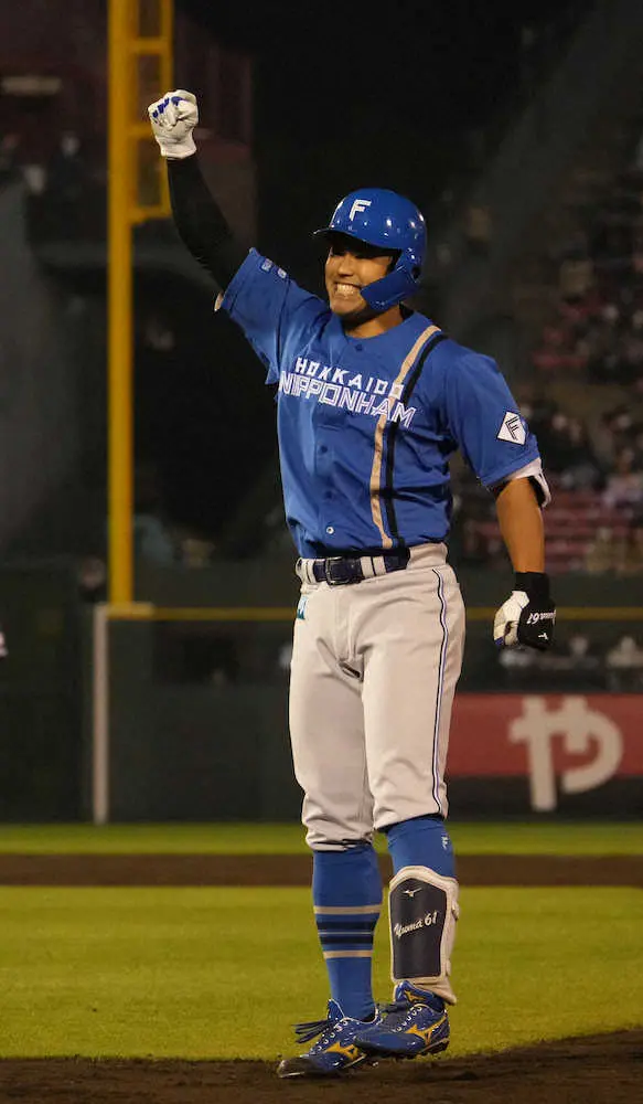 スタメン落ちも覚悟したが、試合前に新庄監督から起用を伝えられて奮起。いつも口にする「執念」を一段とたぎらせた。5回1死一、二塁では左前適時打を放ち「近藤さんと剛さん(松本)がつないでくれたので、“大大執念”で(4番の)清宮につなごうと思って打ちました」。2安打2打点、守備でも5回に本塁返球で補殺を記録してみせた。