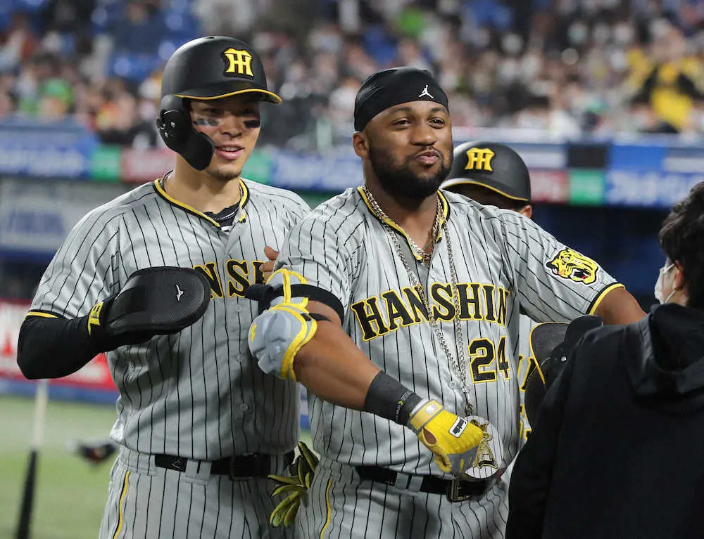 <ヤ・神>7回2死一、三塁、左越え3ランを放った阪神・ロハスは佐藤輝とともにポーズを決める(撮影・大森 寛明)