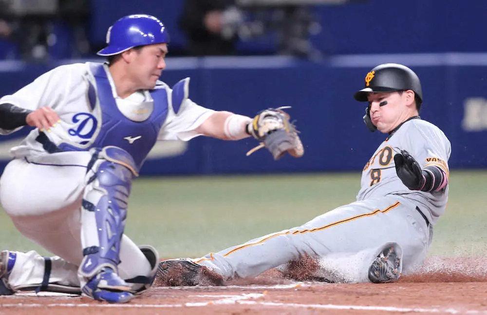 <中・巨>4回、重盗で三塁走者・丸は本塁に滑り込み生還する(撮影・椎名 航)