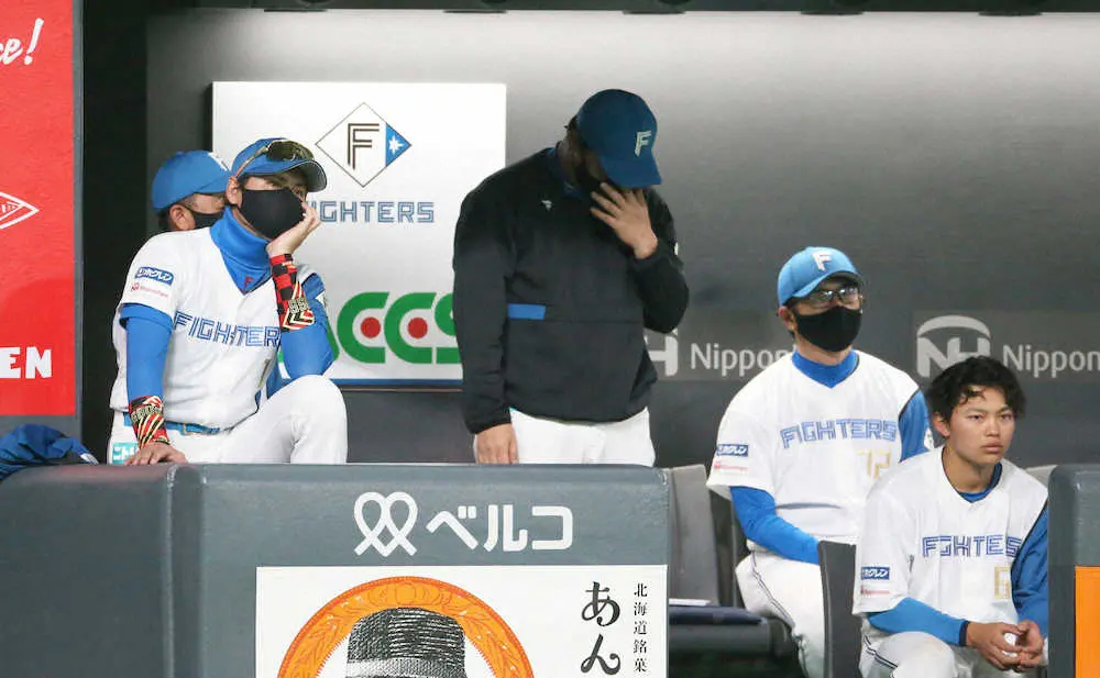<日・ソ>9回、重苦しい雰囲気の新庄監督(左端)ら日本ハムベンチ(撮影・西川祐介)