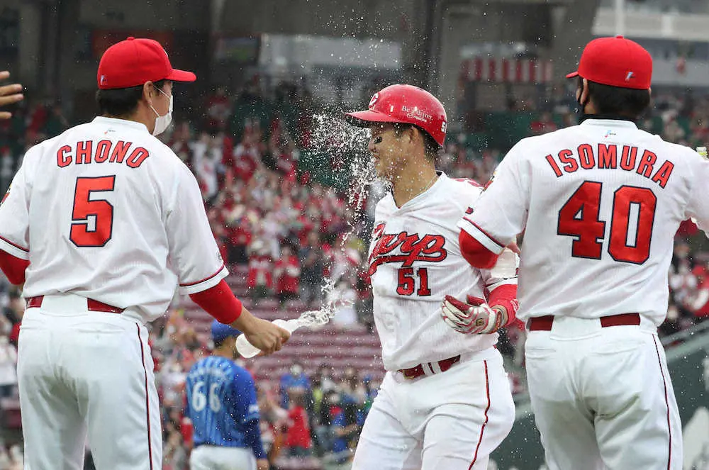 その後、1死満塁で小園に打席が回った。首脳陣から伝えられたのは「高めを狙え」。初球の真ん中高め直球を逃すことなく、飛球を中堅フェンス近くまで打ち上げた。中犠飛が4年目で初のサヨナラ打。「あんまり覚えていない。なかなか結果も出ていなかったので…。チームに貢献できて良かったです」と初めて歓喜のウオーターシャワーにぬれた。