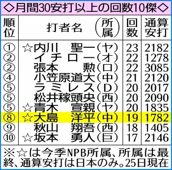 大島は今週対戦する阪神、広島とは今季相性が抜群だ。阪神戦は3試合で12打数5安打の打率.417。広島戦は2日と17日に4安打の固め打ちを見せるなど22打数10安打。打率.455はカード別で最高となっている。36歳以上の中日打者の月間最多安打は84年5月に36歳の谷沢健一がマークした36安打。円熟味を増してきた安打製造機にはこちらの記録更新も狙ってほしい。(記録課・八田 朝尊)