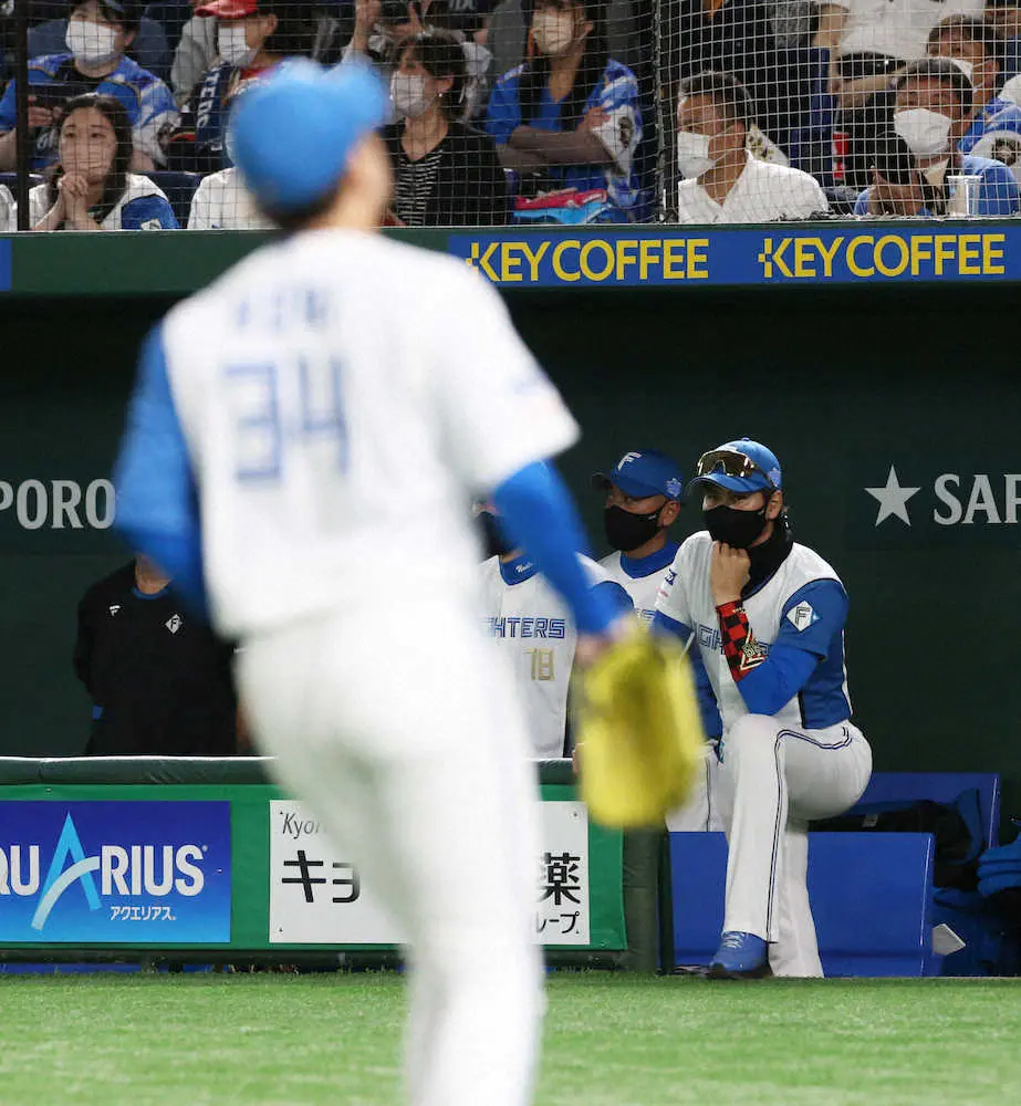 <日・オ>10回、吉田正に適時打を打たれた堀(左)を見つめる新庄監督(撮影・西海健太郎)