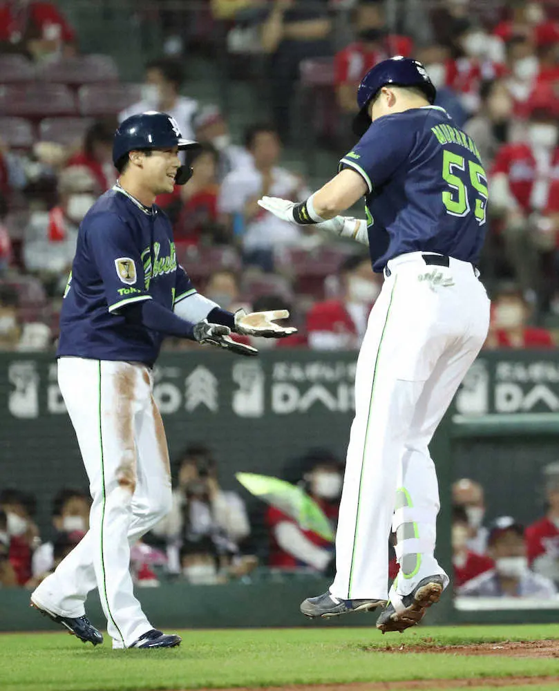 ホームインするヤクルト・村上を、ハイタッチで山田が迎えた。今季2度目のアベック弾。自慢の主軸がそろって快音を響かせた。