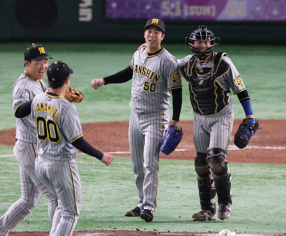 <巨・神> 完投勝利に笑顔の青柳(右から2人目)と梅野のバッテリー(撮影・大森 寛明)