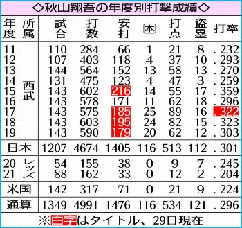 ◇秋山翔吾の年度別打撃成績◇ Photo by スポニチ 西武 秋山に復帰オファー 渡辺GM認めた!5月帰国時に直接交渉 日本希望… ギャラリーで見る この記事のフォト 2022年04月30日の画像一覧 もっと見る 2022年04月30日の画像をもっと見る