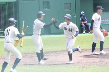 初回に5番の富崎大都捕手(3年)が先制の2点適時打。初回から5回まで毎回安打が飛び出すなど着実に加点して相手を突き放した。福寿大智主将(3年)は「素直にうれしい」と話した。