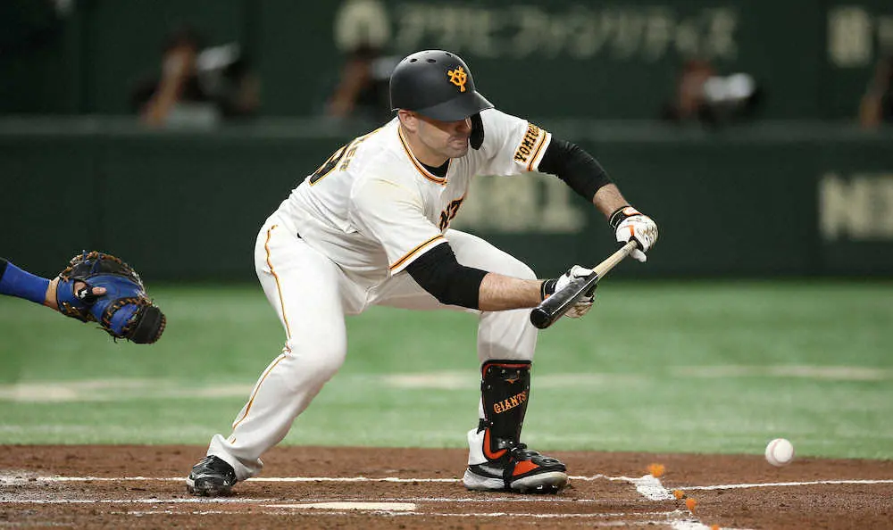 <巨・神>2回、スクイズを決めるシューメーカー(撮影・河野 光希)