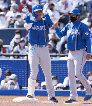 <ロ・日>2回、勝ち越し打を放ちナインの出迎えを受ける清宮を見つめる新庄監督(撮影・沢田 明徳)