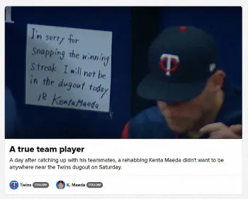 ツインズ・マエケンの“置き手紙”が話題 ベンチに「連勝止めてごめんなさい」