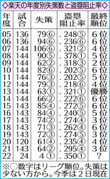 さらに、今季の楽天はチームの盗塁阻止率が.350でリーグ1位。個人ではベテランの炭谷が.467と高阻止率を残している。そういえば、前回日本一になった13年は球団史上唯一リーグ最少失策を記録。チーム盗塁阻止率も1位だった。再び強固な守りを武器にV奪回を目指す構えだ。(記録課・宮入 徹)