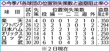 【Weekly Data展望】楽天の守備陣が充実している。2日現在、チーム失策数は4。パで次いで少ないソフトバンクと日本ハムが12だから差は大きい。楽天は24試合を消化し、1試合平均の失策数は0.17。シーズン143試合で換算すると24失策になる。チームのシーズン最少失策は91年西武(130試合)、17年ソフトバンク(143試合)の各38。両チームの開幕24試合時の失策数は西武が4でソフトバンクが7。楽天は上々の滑り出しといえるだろう。