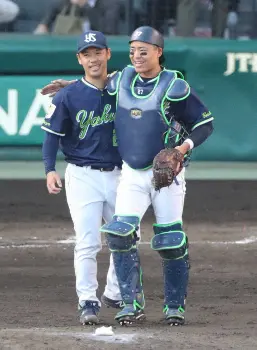 <神・ヤ>完封で今季初勝利を挙げ、中村(右)に祝福される小川(撮影・成瀬 徹)