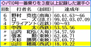 パ10号一番乗りを3度以上記録した選手 Photo by スポニチ 西武・山川 チームで中西以来の3度目リーグ10号一番乗り 打てば8勝全勝“… ギャラリーで見る この記事のフォト 2022年05月04日の画像一覧 もっと見る 2022年05月04日の画像をもっと見る