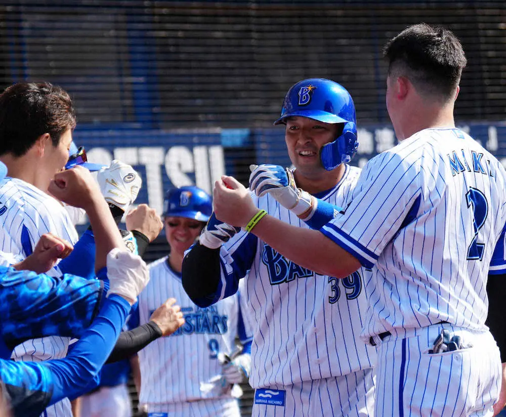 <D・中>4回、嶺井が左越えに先制2ランを放ちベンチの出迎えを受ける(撮影・篠原岳夫) Photo by スポニチ DeNA・嶺井 3年ぶり一発で先制「つなぐ意識で行ったことが最高の結果とな… ギャラリーで見る この記事のフォト 2022年05月04日の画像一覧 もっと見る 2022年05月04日の画像をもっと見る