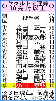 《球団10傑入り85勝目》小川(ヤ)が自身10度目の完封で通算85勝目。無四死球での完封は、19年9月19日阪神戦、昨年5月15日中日戦に次ぎ3度目だ。ヤクルトで通算10完封以上は金田正一(当時国鉄=78完封)らに次ぎ13人目。通算85勝は金田の353勝を筆頭に梶間健一、館山昌平に並ぶ球団10位と10傑入りを果たした。