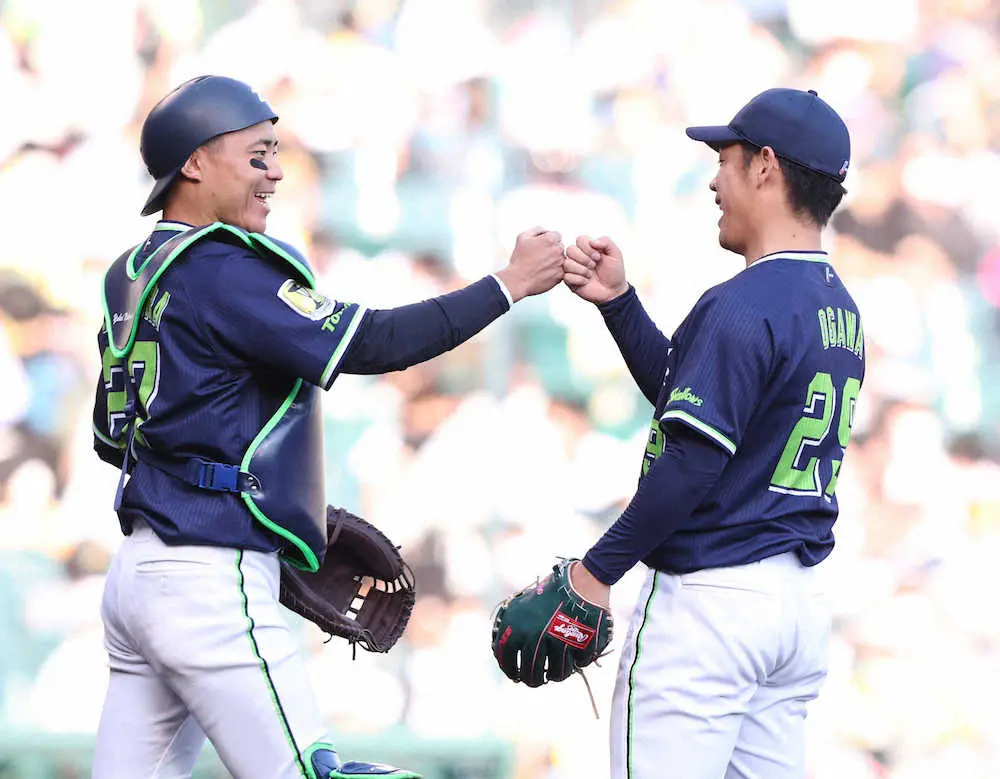 <神・ヤ> 完封勝利に笑顔の小川(右)と中村のバッテリー(撮影・大森 寛明)