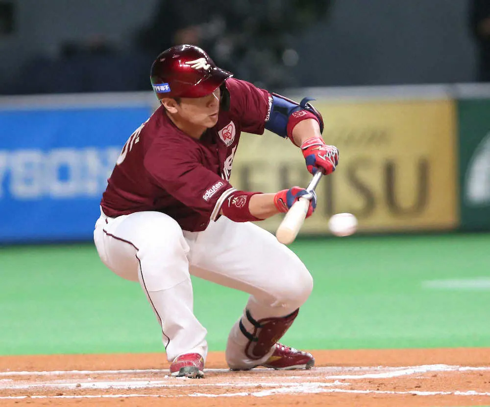 <日・楽>6回、勝ち越しのセーフティースクイズを決める辰己(撮影・高橋 茂夫) Photo by スポニチ 楽天 2者連続スクイズの奇襲で7連勝 リーグ最速20勝到達 貯金14で首位… ギャラリーで見る この記事のフォト 2022年05月06日の画像一覧 もっと見る 2022年05月06日の画像をもっと見る