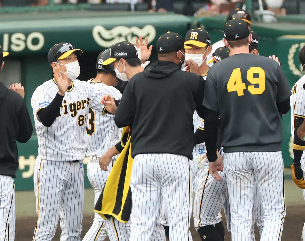 <神・ヤ>ヤクルトにサヨナラ勝利し、ナインとハイタッチをする矢野監督(左)(撮影・平嶋 理子)
