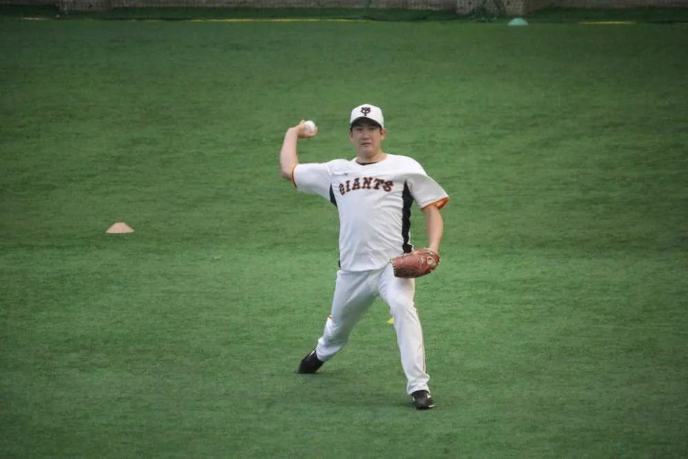 右肘違和感で4月30日に出場選手登録を外れた巨人の菅野が、ジャイアンツ球場で離脱後初のブルペン入り。中腰の捕手に35球投げた。