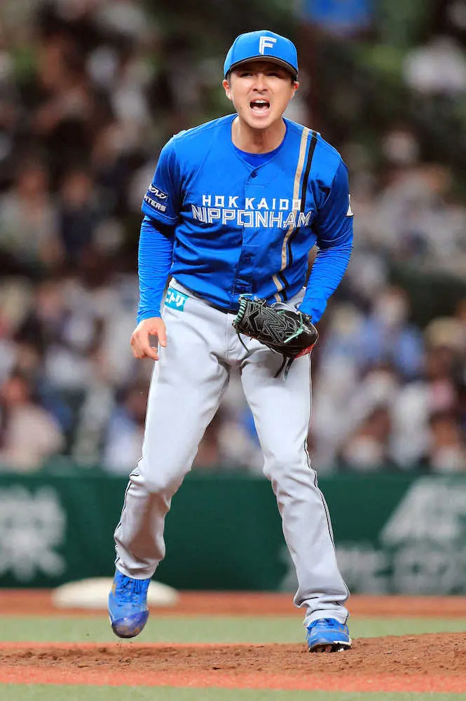 <西・日>7回、古賀を三振に斬り雄たけびを上げる日本ハム・上沢(撮影・久冨木 修)