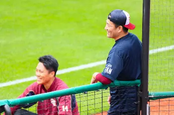 <巨・ヤ>メンバー交換時、ピンク色の帽子で登場した審判団に思わず笑顔の原監督(撮影・村上 大輔)