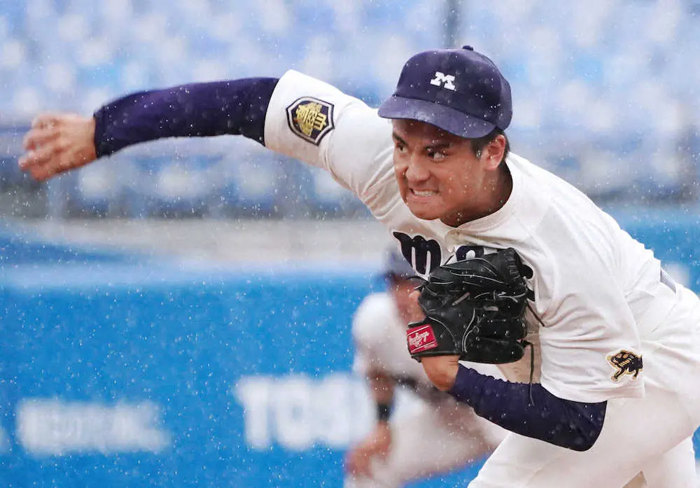 明大・蒔田稔(3年=九州学院)が法大打線を散発の3安打、9奪三振116球の完封で1勝1敗1分のタイに持ち込んだ。