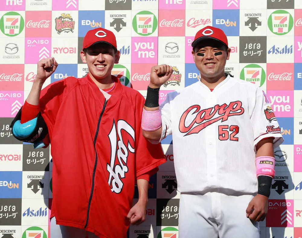 <広・D>ヒーローインタビューを終えポーズをとる末包と遠藤(左)=撮影・奥 調