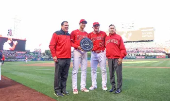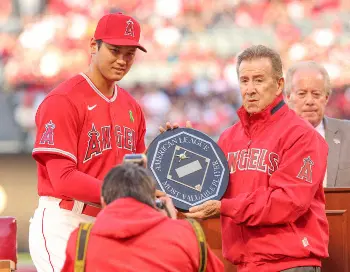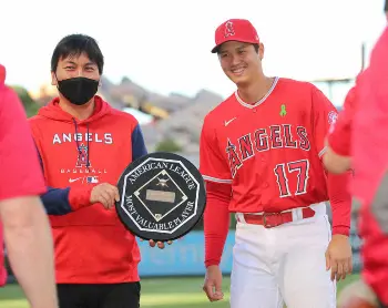 <エンゼルス・レイズ> MVPの盾を持つ水原通訳(左)と笑顔の大谷(撮影・光山 貴大) Photo by スポニチ エンゼルス大谷 試合前に昨季MVP受賞セレモニー 手を振って声援に応える ギャラリーで見る この記事のフォト 2022年05月11日の画像一覧 もっと見る 2022年05月11日の画像をもっと見る