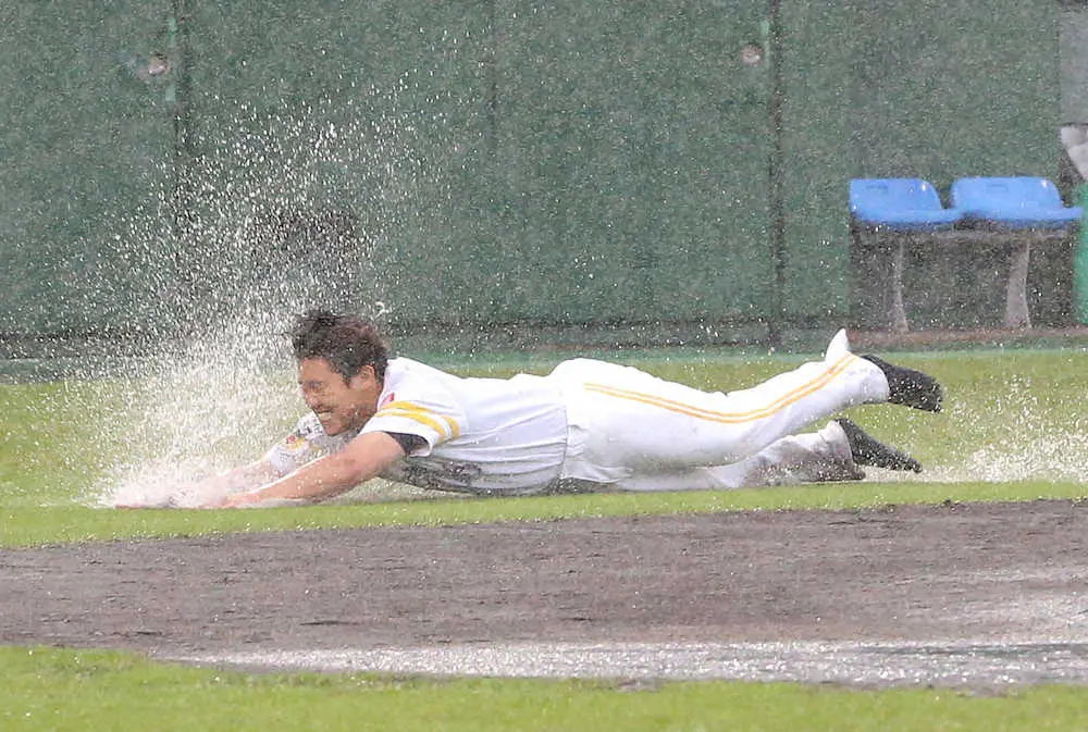 降りしきる雨の中、一塁ベンチを飛び出し、スライディングを連発。最後にヘッドスライディングで生還すると拍手喝采を浴びた。「少しでも楽しんでいただきたい気持ちでした。次はプレーで楽しんでもらえるようにしたい」とファンサービスを振り返った。