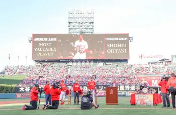「46本塁打+9勝」。歴史的二刀流の活躍で昨季MVPに輝いたエンゼルス・大谷が、スタンディングオベーションと「MVP」コールで迎えられた。試合前に行われた表彰セレモニー。アート・モレノ・オーナーも、自宅のあるアリゾナから駆けつけ、快挙を再び称賛した。