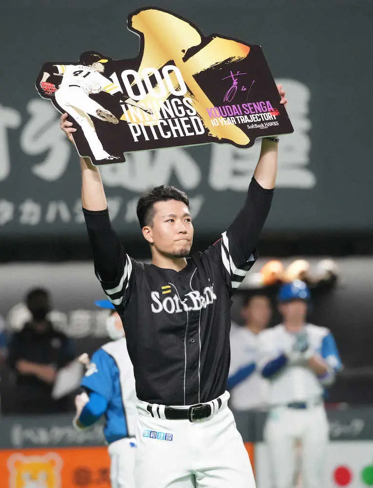通算1000投球回を達成しボードを掲げる千賀(撮影・高橋茂夫)
