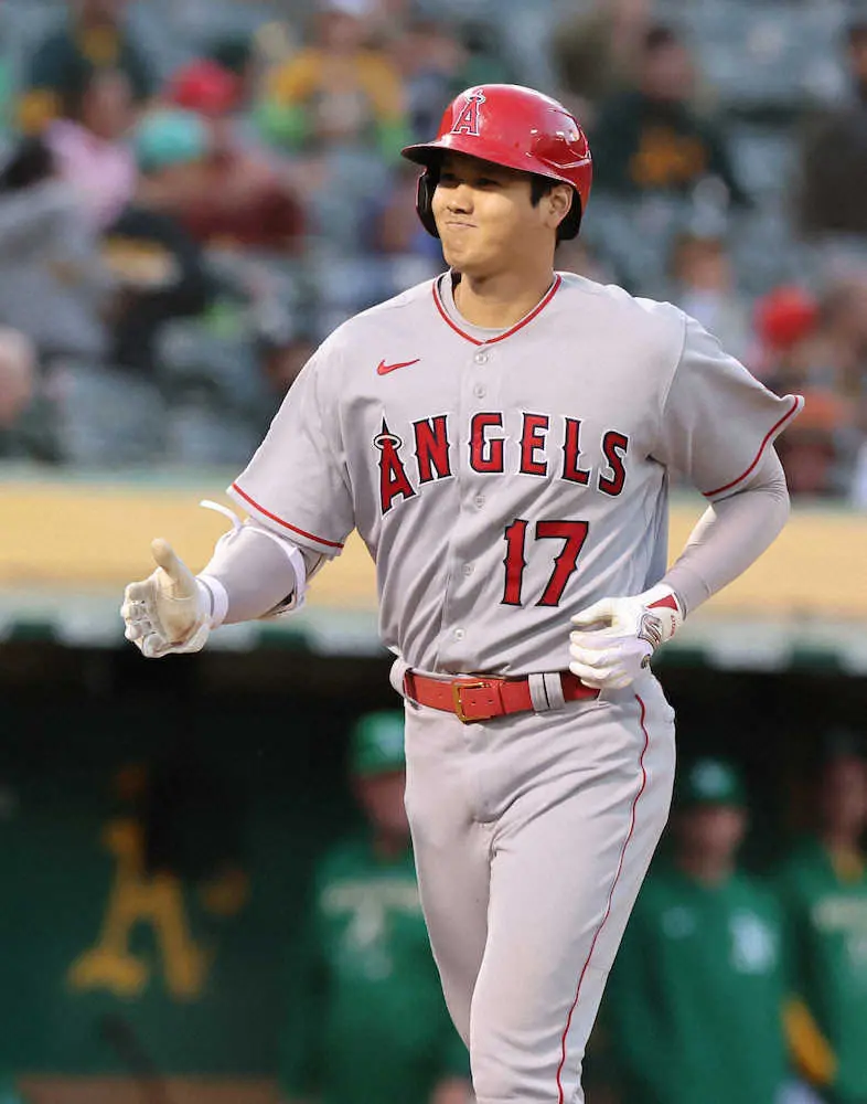 <アスレチックス・エンゼルス> ダブルヘッダーの第2試合の5回、メジャー通算100号となる今季7号・2ランを放ち、笑顔を見せる大谷(撮影・光山 貴大)