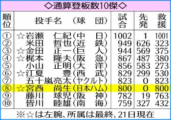 ≪全試合救援達成は五十嵐以来≫宮西(日)が21日の西武戦で通算800試合登板を達成。プロ野球8人目、パでは米田哲也(阪急、近鉄)914試合、梶本隆夫(阪急)867試合に次ぐ3人目となった。宮西は初登板の08年3月25日の西武戦からすべて救援登板。初登板から800試合連続救援登板は823試合の五十嵐亮太(ヤクルト)に次ぐ2人目で、パでは初めてとなった。
